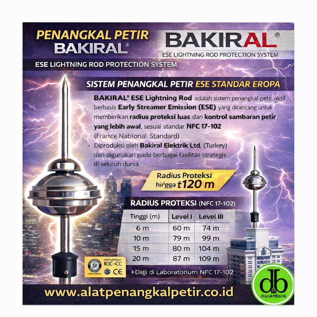Radius proteksi Bakiral sudah diuji sesuai standar internasional NFC 17-102, menjadikannya sistem ESE yang andal dan terukur. Model tertentu seperti Bakiral Alfa dapat memberikan cakupan proteksi hingga 120 meter — artinya satu perangkat bisa melindungi area seluas stadion kecil.